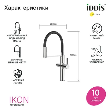 Смеситель для кухни с каналом для фильтрованной воды и гибким изливом, хром, Ikon, IDDIS, IKNSBFFi05